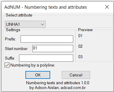 If you select a block with attributes, choose the attribute tag to number in the pop-up. If you select a text, the pop-up list will be disabled for selecting a tag. For both cases, set the prefix, suffix, and starting number (prefix and suffix are optional). You can also select the option Numbering by a polyline.