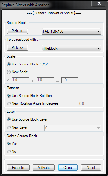 Then you can see many options are there in the main dialog of the program that controls the XYZ Scale, Layer, Rotation and Deletion of the source blocks.