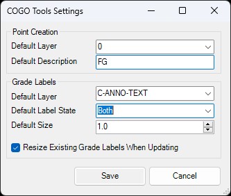Insert and modify COGO points within a drawing, setting elevations relative to other points or alignments/profiles with labels showing grade and/or elevation difference between points. Points can also be added at set distances/grades from existing points, or at the calculated intersection of specified grades between existing points.