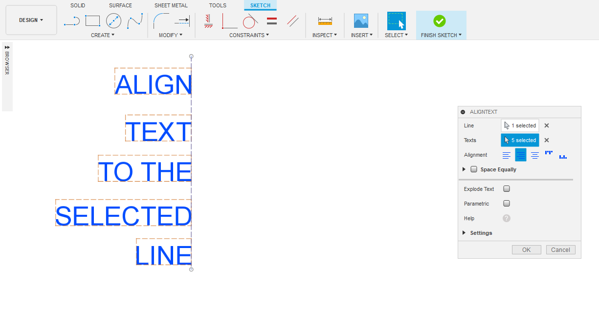 Align Text add-in aligns texts to the selected line. This add-in allows you to specify the alignment line, texts, alignment type and spacing. It has an option to break the texts into profiles.
