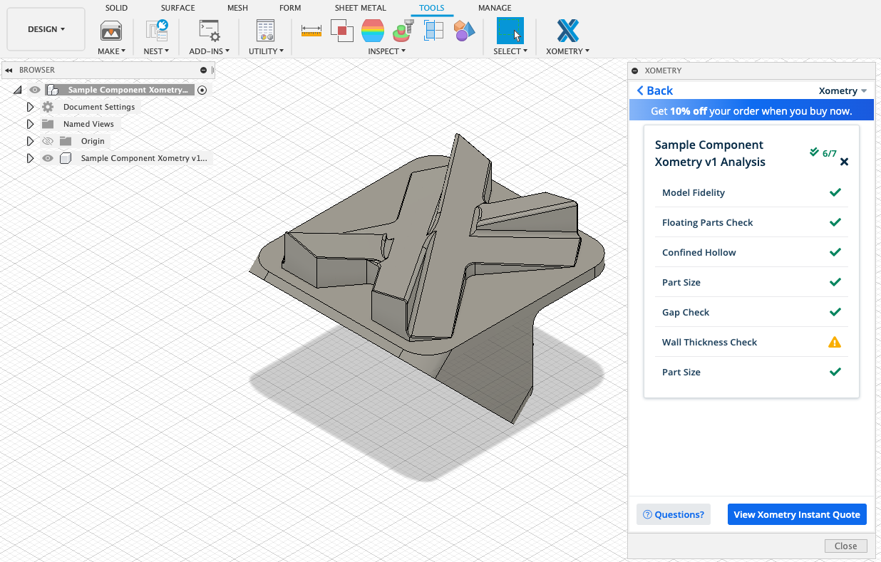 Use the Fusion Xometry App to directly order designs through Xometry which offers a wide range of manufacturing processes including 3D printing, CNC, sheet metal, urethane casting, and more. Customers who order parts from Xometry through the Xometry app receive 10% off their order (for a limited time at the participating market).