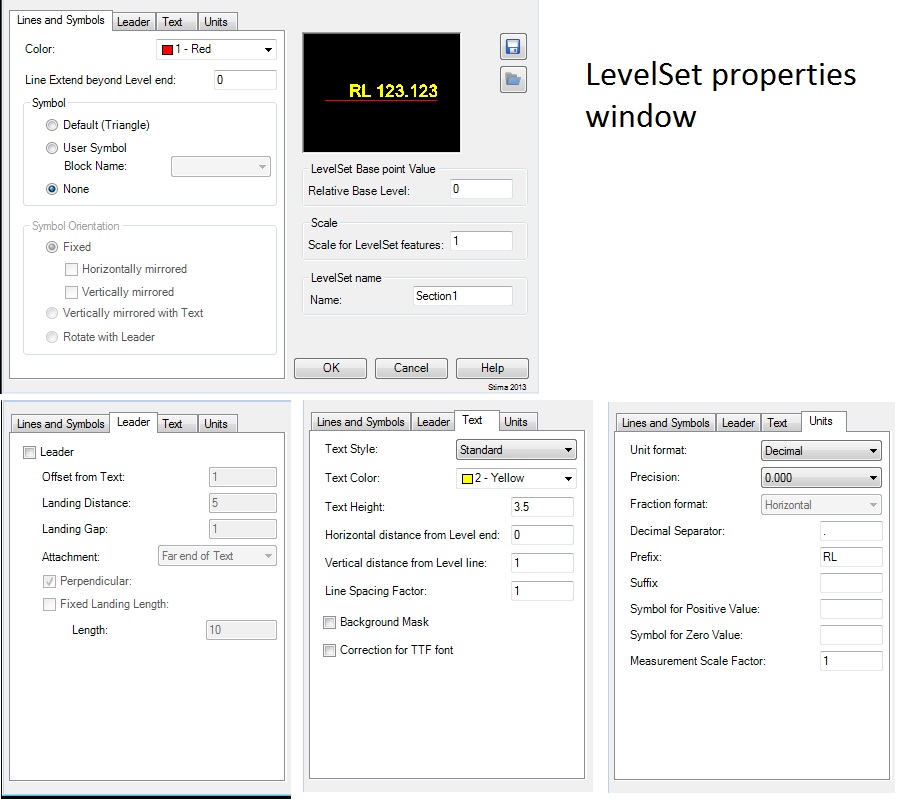 To create a new LevelSet run command RLCREATE or RL. Dialog window has similar settings as native Autodesk® AutoCAD® dimension style manager, they are self-explanatory therefore below are just a few explanations: