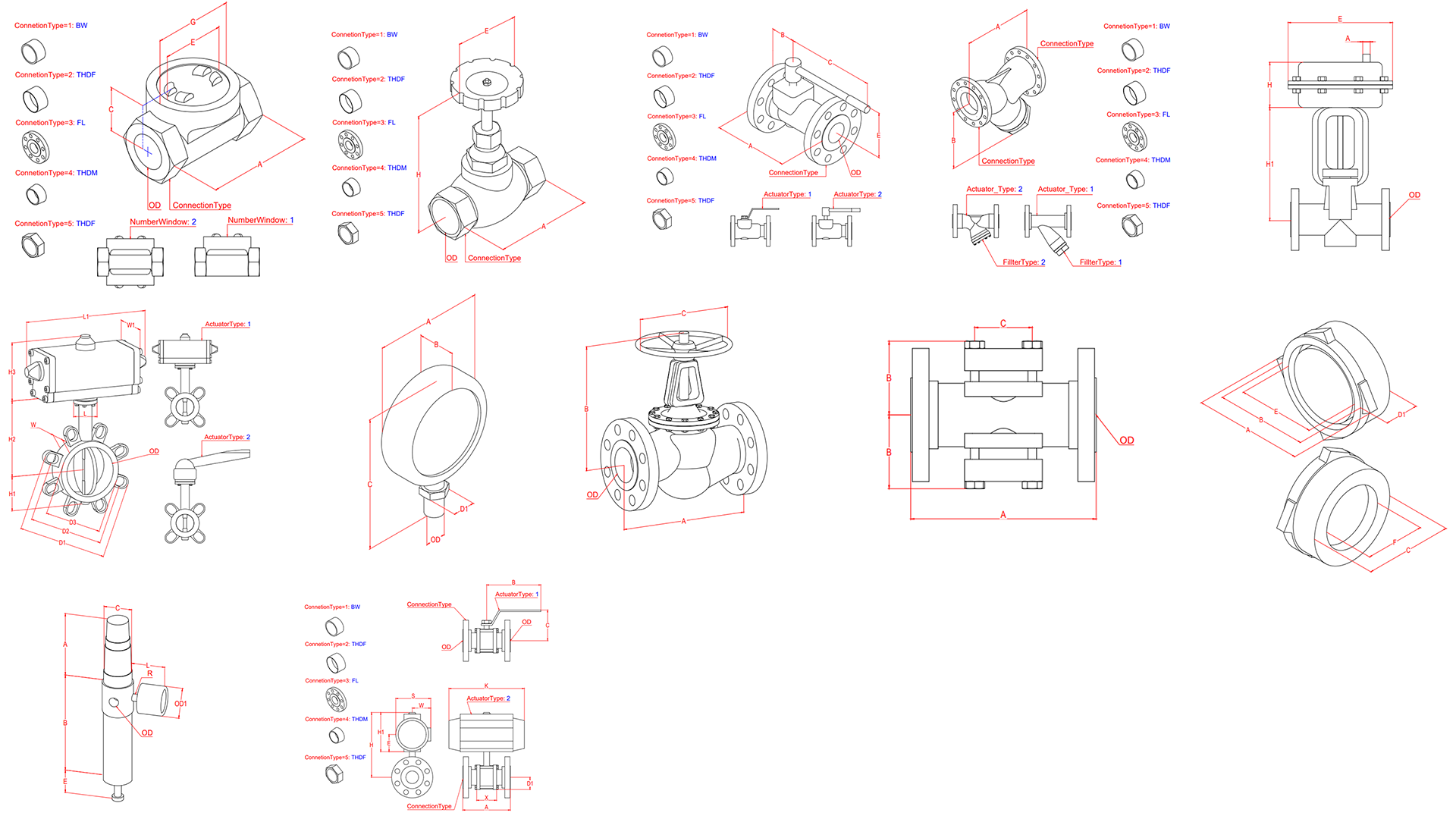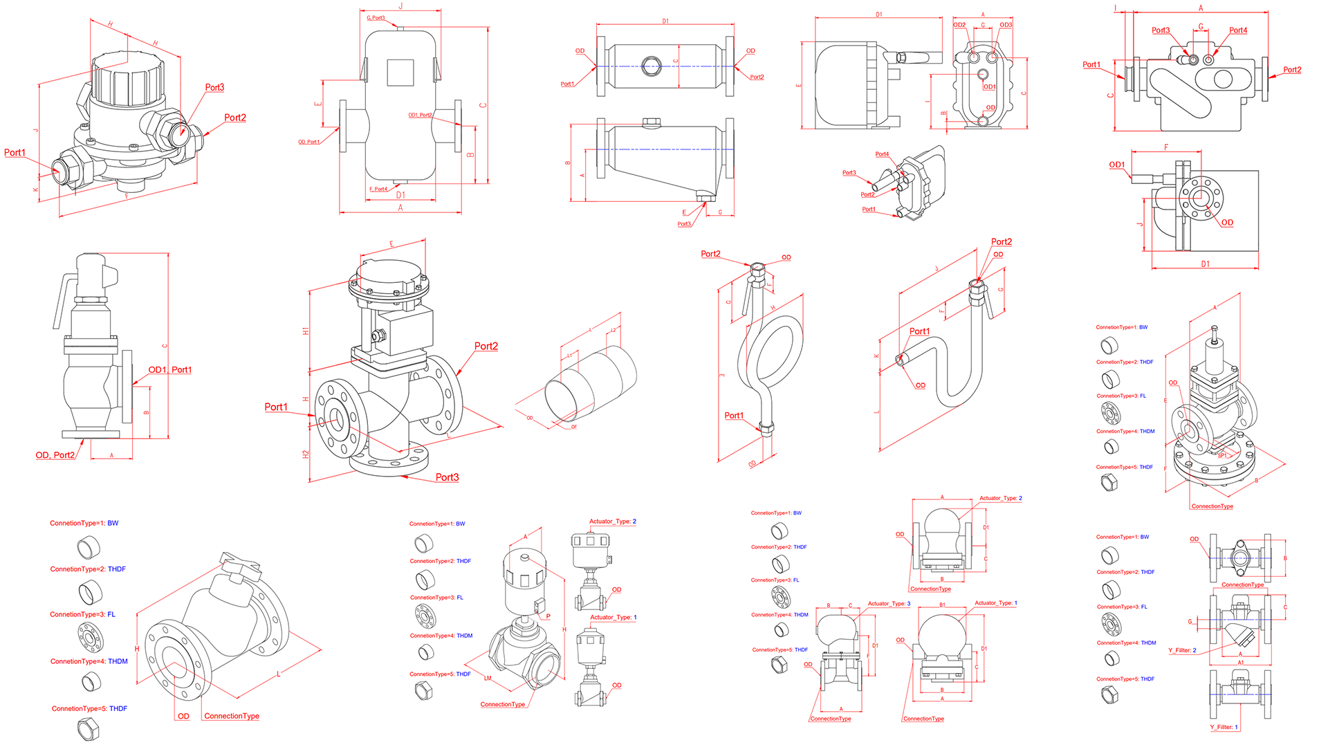 - All the parts are parametric Python parts, so you can adapt to your standard if needed, by default, it adapts using Spirax Sarco, Samson datasheet.