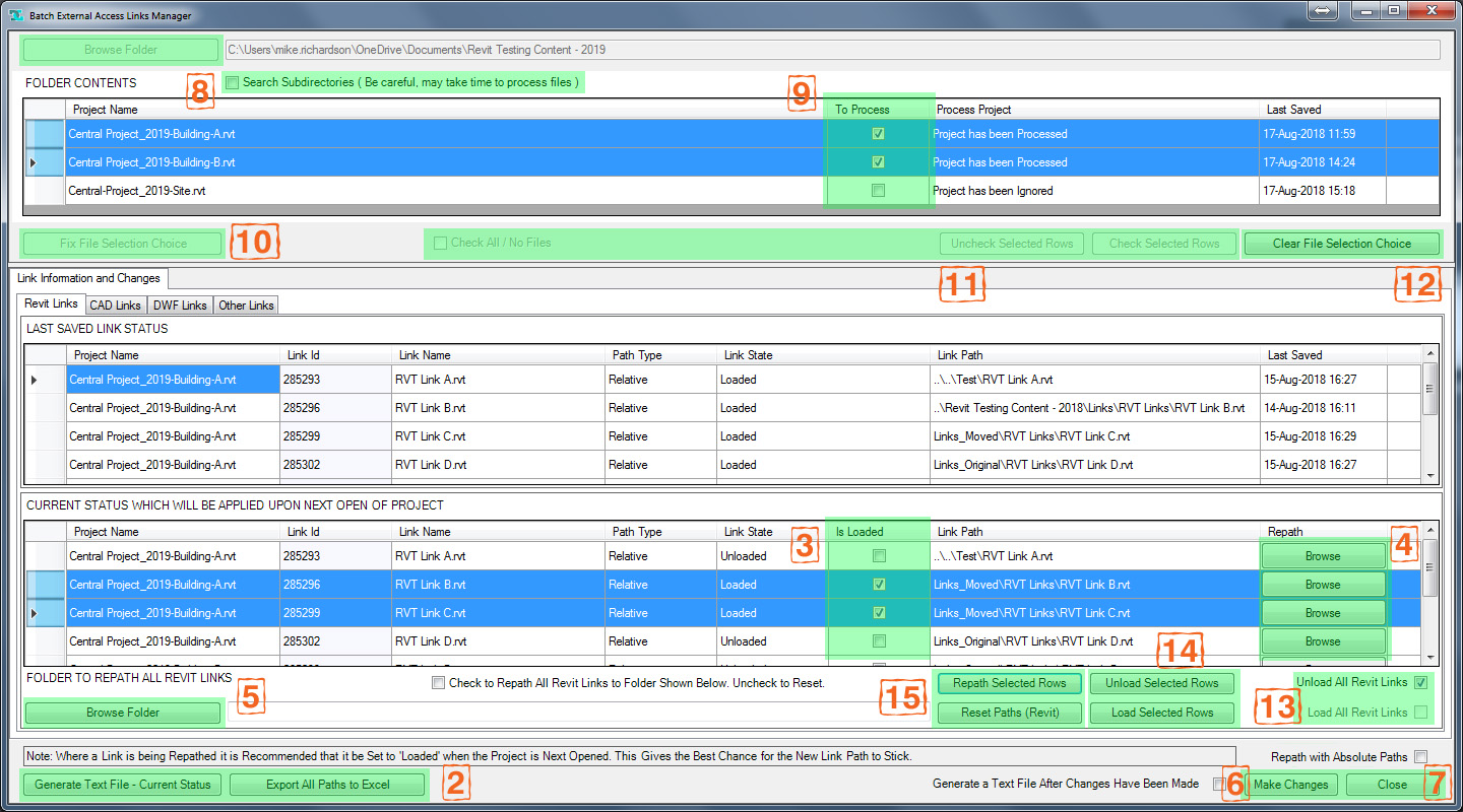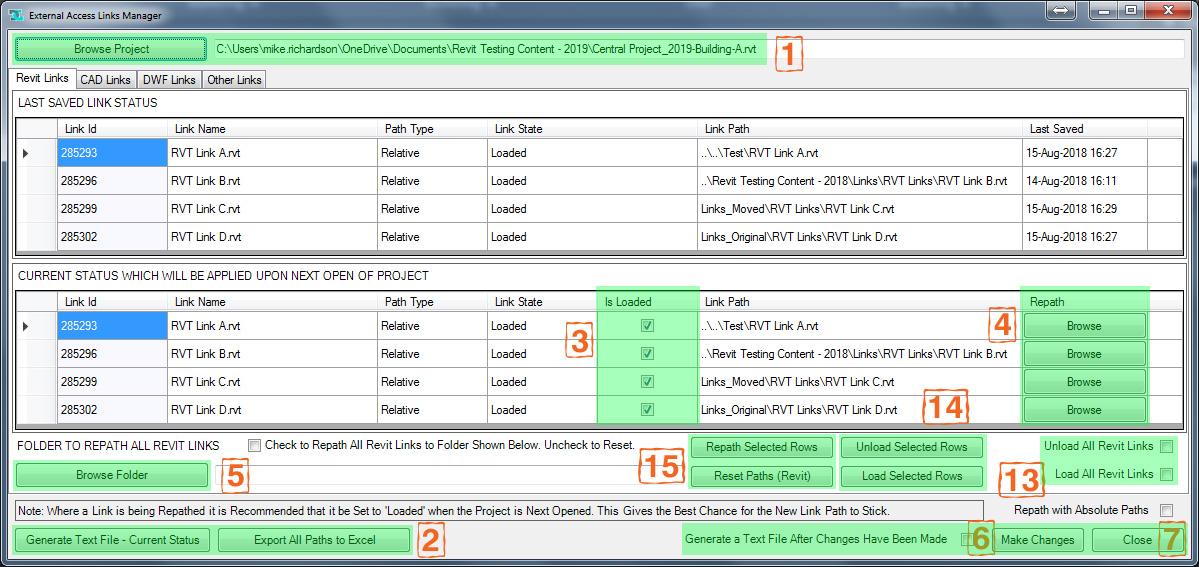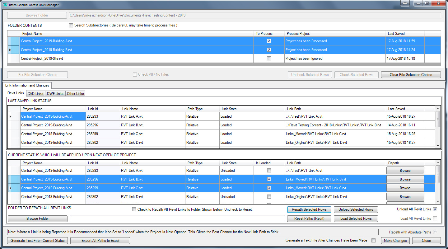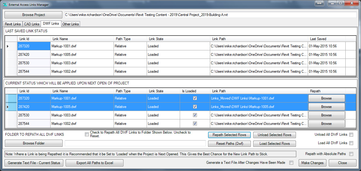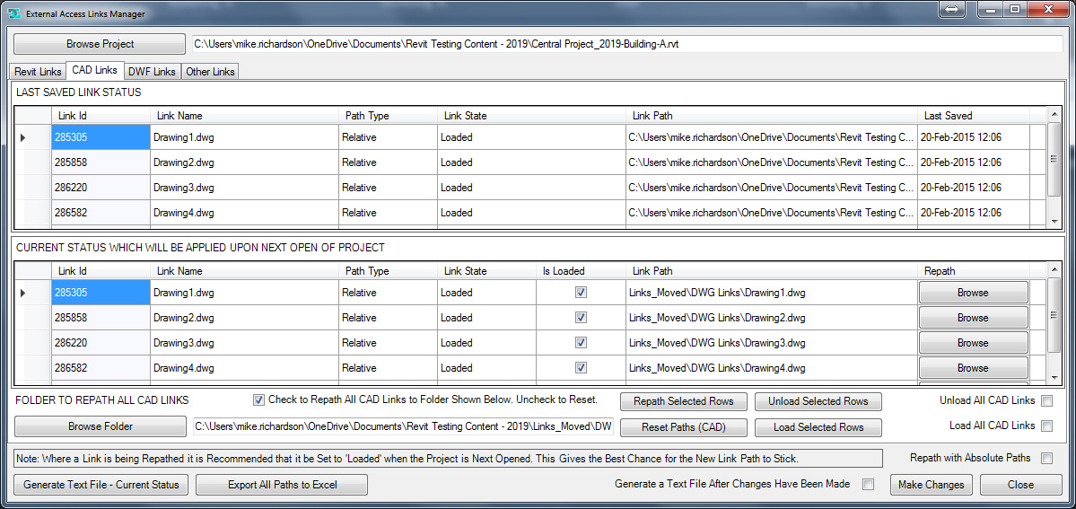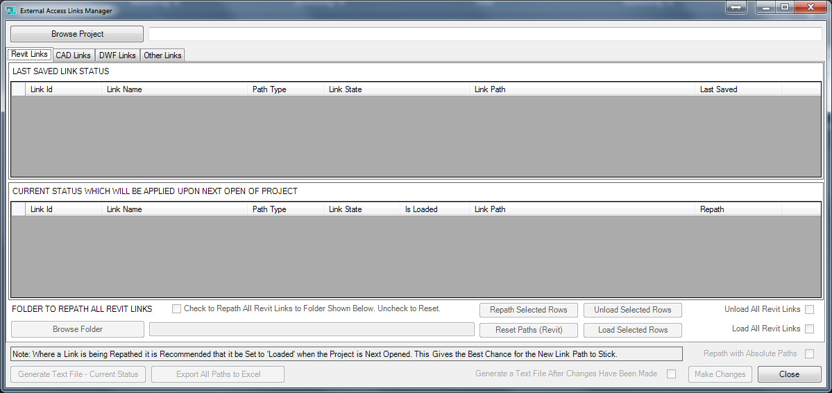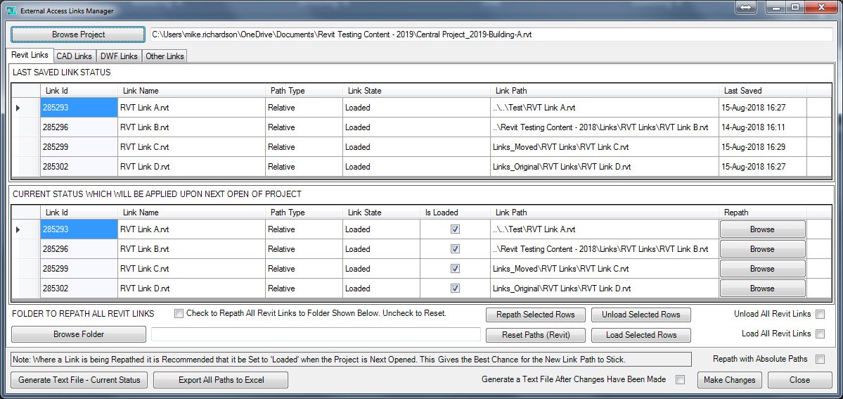 The TXT and Microsoft Excel reports can be generated without any changes being made to the Revit project file. They can also be generated after changes have been made. In each case the 'Last Saved' state of the links in a Revit project and the 'status which will be applied to the links when the Revit project is next opened' will be printed to the file.