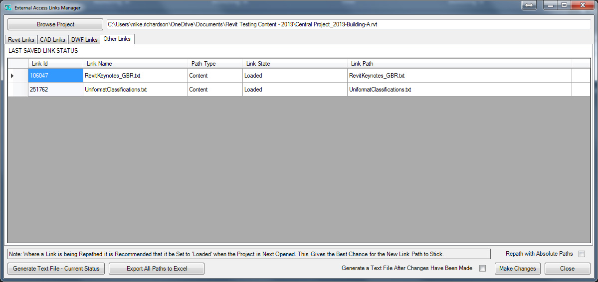 Once a Revit project file is selected, the 'External Access Links Manager' interface populates with data about the links in that project. Actions can then be performed on those links including re-pathing and setting the links to be loaded or unloaded the next time the project is opened. The user can also generate TXT or Microsoft Excel reports which will list out information about every link associated with that Revit project file.