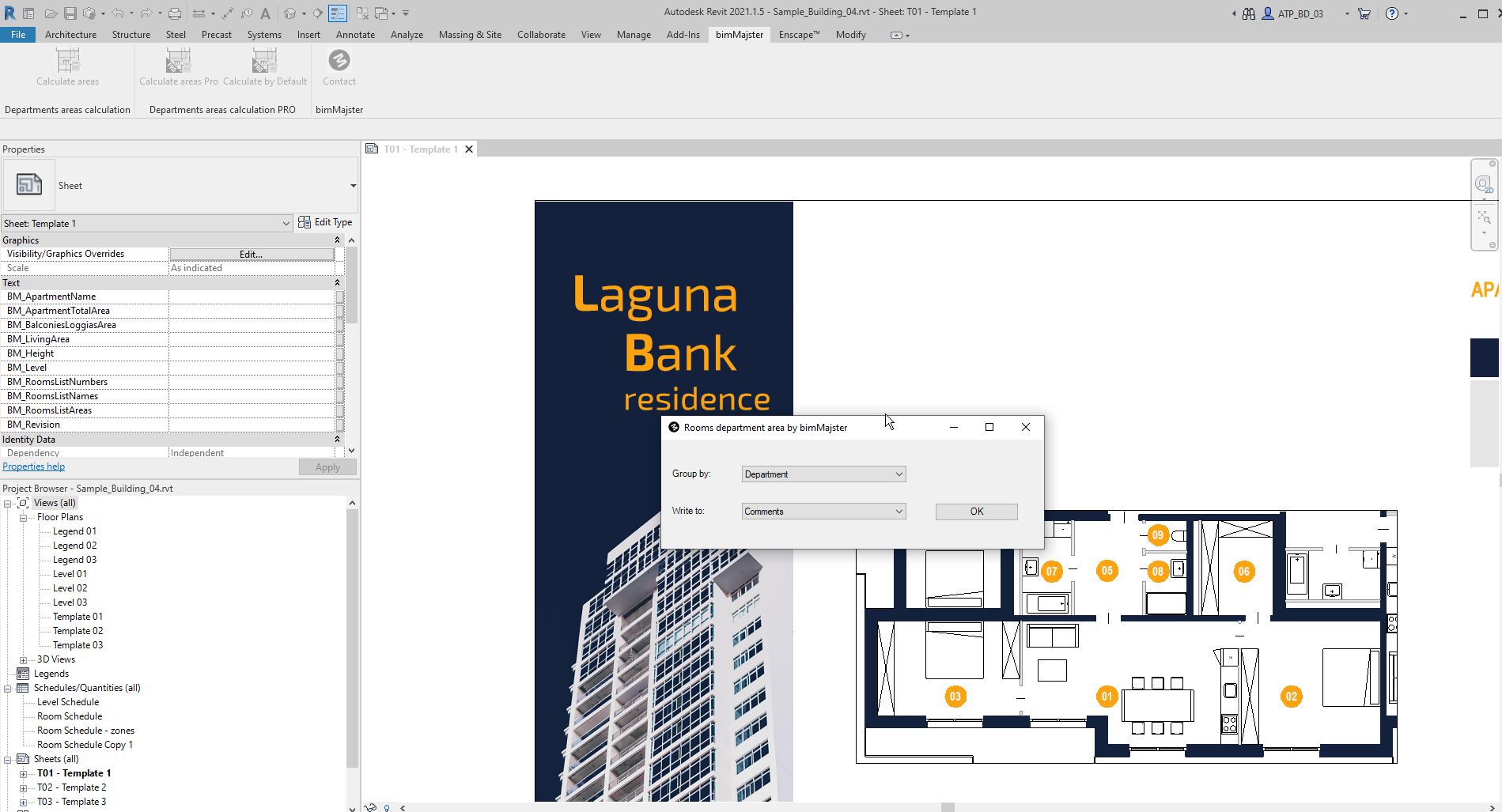 This app allows the summarizing of areas for rooms that belong to one department. The summed area is then written back to rooms into the desired parameter. Because of this, it is possible to show in plans the areas of departments with standard Autodesk® Revit® tags. Values are updated when the script is restarted. Rooms are grouped by the same values of the desired parameter.