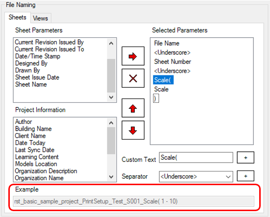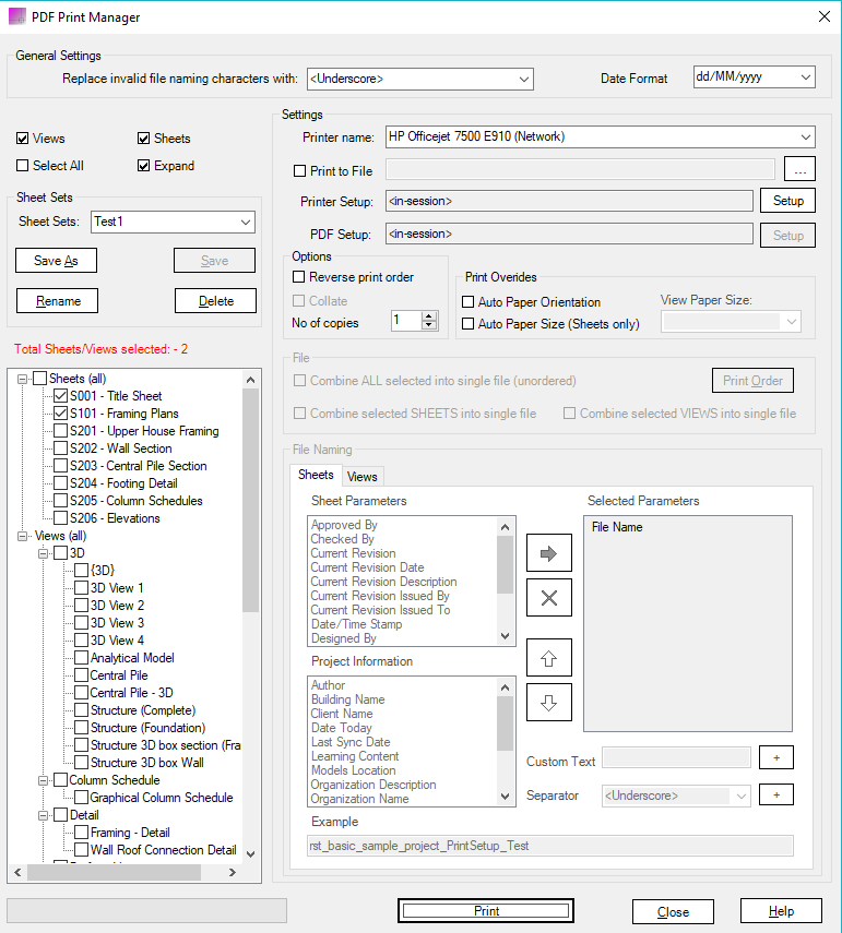 The advanced filename rules utilize sheet, view and project information parameters to compose file naming rules. You also have the option to utilize separators and bespoke text within the naming rules providing unlimited possibilities.