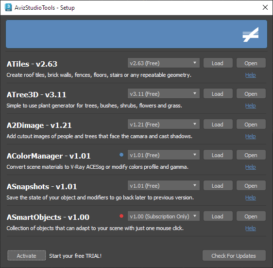 - ASmartObjects - With this tool, you can import and use our collection of smart objects that can adapt to your scene with just one mouse click.
