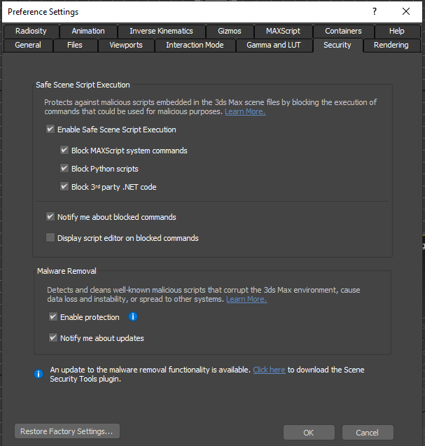 Les outils de sécurité des scènes 3ds Max constituent la méthode recommandée par Autodesk pour détecter et supprimer plusieurs scripts tiers malveillants connus : CRP\ADSL, ALC, ALC2, PhysXPluginMfx, MSCPROP et leurs variantes. Les scripts malveillants peuvent endommager l’environnement 3ds Max, provoquer des pertes de données, rendre le logiciel instable et/ou se propager à d’autres systèmes lors du partage des fichiers de scènes 3ds Max.