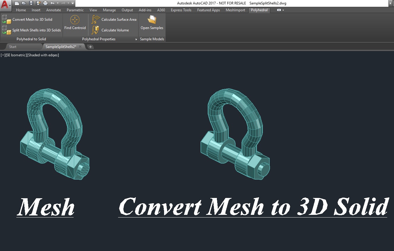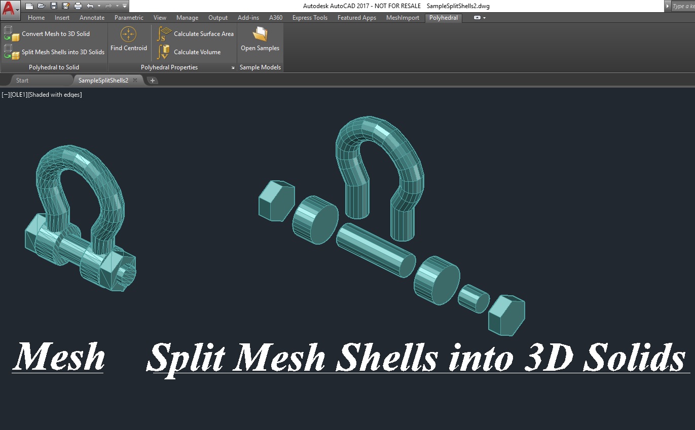 Polyhedral Mesh to Solid is for hard to convert Mesh or Polyface Mesh objects, which won’t convert to 3D Solids because of self-intersecting faces, T-Junctions, gaps, inverted normals, etc. These are common problems when working with a mesh imported from other sources. Polyhedral Mesh to Solid’s conversion method optimizes the mesh to reduce tessellation and removes unseen faces, producing a more visually clean solid without affecting the accuracy of the geometry. Polyhedral Mesh to Solid can also be used to split a mesh into its component shells if desired, producing a separate 3D solid of each shell within a single mesh.