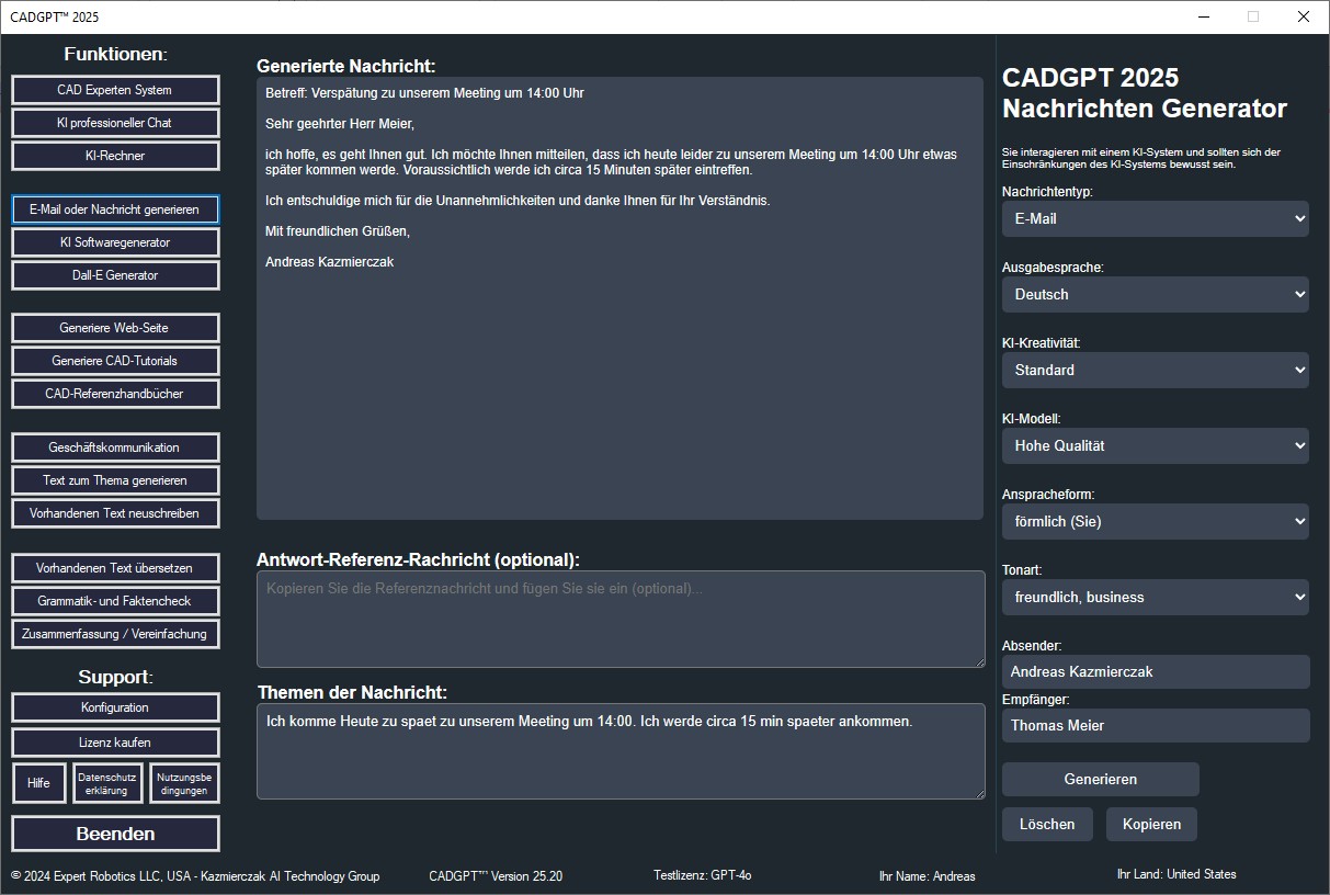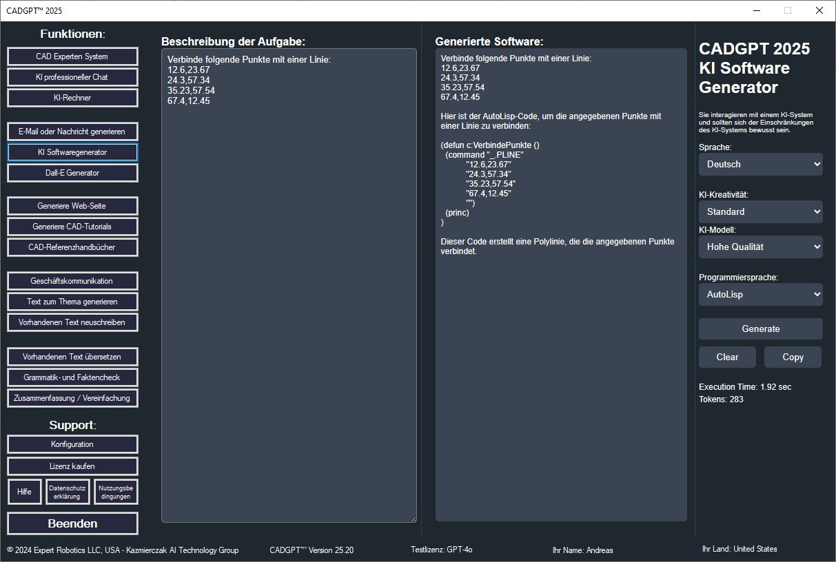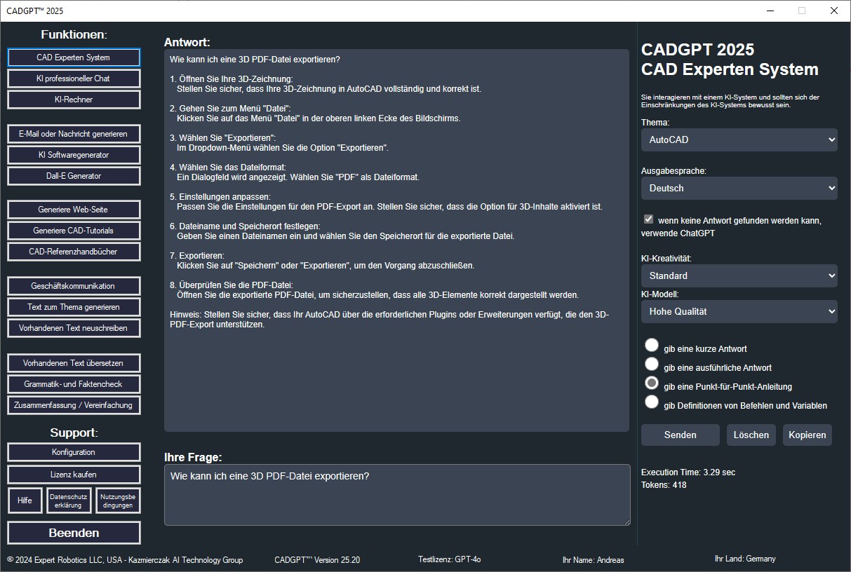 CADGPT 2025 - Künstlicher Intelligenz-Assistent für alle CAD-bezogenen Aufgaben und Designarbeiten. Angetrieben von ChatGPT und Expert Robotics Tools. Zu den Funktionen gehören ein KI-Rechner, ein KI-Textgenerator, ein ObjectARX- und LISP-Code-Generator, ein CAD-E-Mail-Generator und 24/7 CAD-Support.