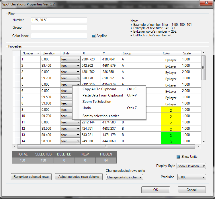 Run SPEDPROPS command to open a design spreadsheet window for editing many Spot Elevations all at once. On this spreadsheet, you can renumber Spot Elevations in increasing order, adjust their elevations by a specified distance, change their colors, scales, unit settings, and many more. This is a powerful command to manage Spot Elevation properties.