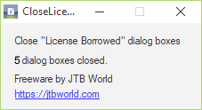 Looks like there is room for improvement. It looks for windows containing "License Borrowed" in the title and closes it. I will find a way to limit this to the expected dialog box only.