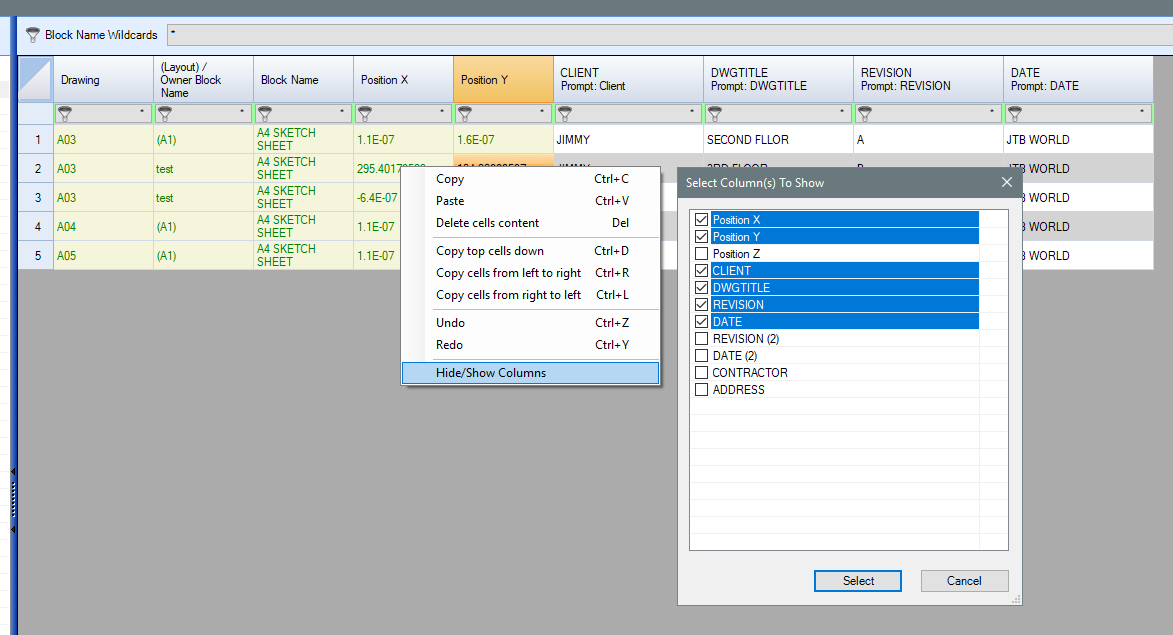 This batch attribute editor app for Autodesk® AutoCAD® collects attributes in all blocks of specified name patterns in multiple drawings and displays them in a wide spreadsheet. Then, you can edit attribute texts as easily as working with Excel. Once done, click "Apply Attribute Changes" to update the values to drawings.