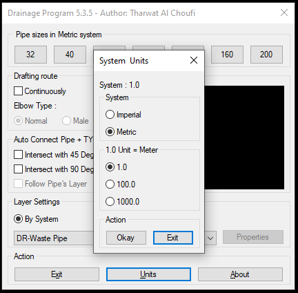 Using this app, you can draft the Drainage System professionally, using the two systems - Inch and Metric. In metric, two scales are provided, 1.0 and 1000.0. The 1.0 scale means 1.0 unit is equal to one meter in the drawing and the 1.000.0 scale means 1000.0 unit is equal to one meter. You can choose which one you prefer as per your drawing settings/units but currently with Trial version you can use just one scale which is 1.0 and once you purchase your full and permanent copy of the program then you can enjoy the entire fore-said scales.