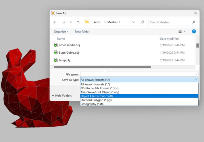 - Import and export of 3DS, OBJ, OFF, PLY, and STL file formats.