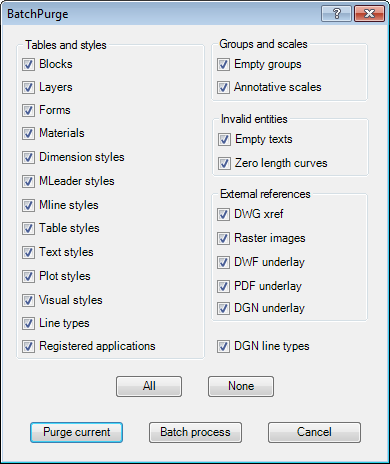 Besides the styles and tables purgeable with native command, BatchPurge offers the opportunity to purge other unreferenced objects: groups, annotative scales, external references (DWG references, raster images, and underlays), obsolete entities (empty text and entity zero length) and DGN complex line styles.