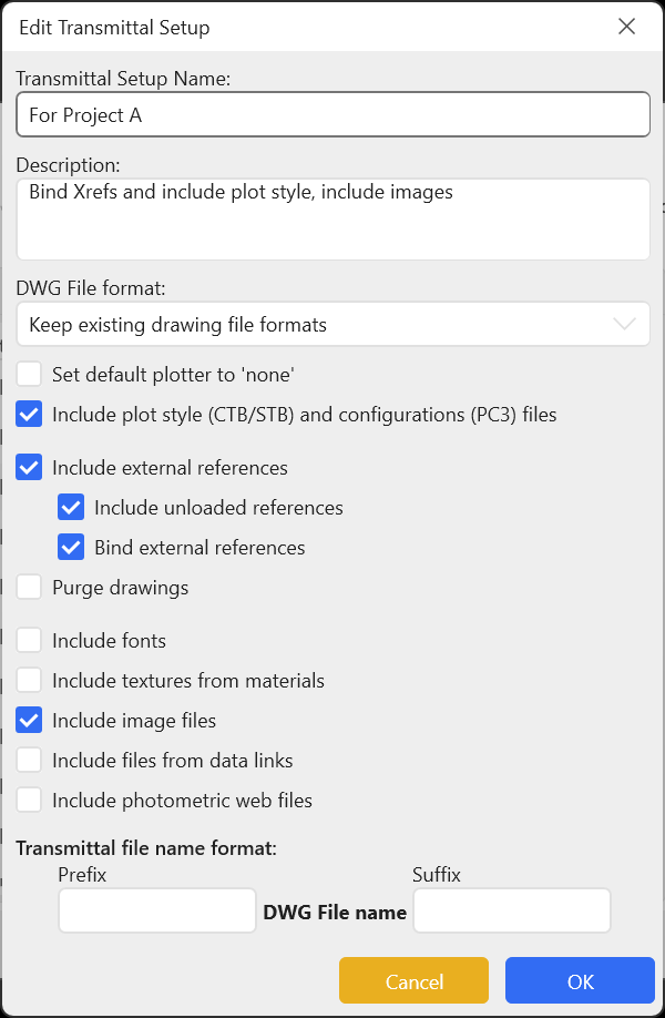 - Supports AutoCAD transmittal options (Xrefs, file format conversion, ZIP compression, etc.).