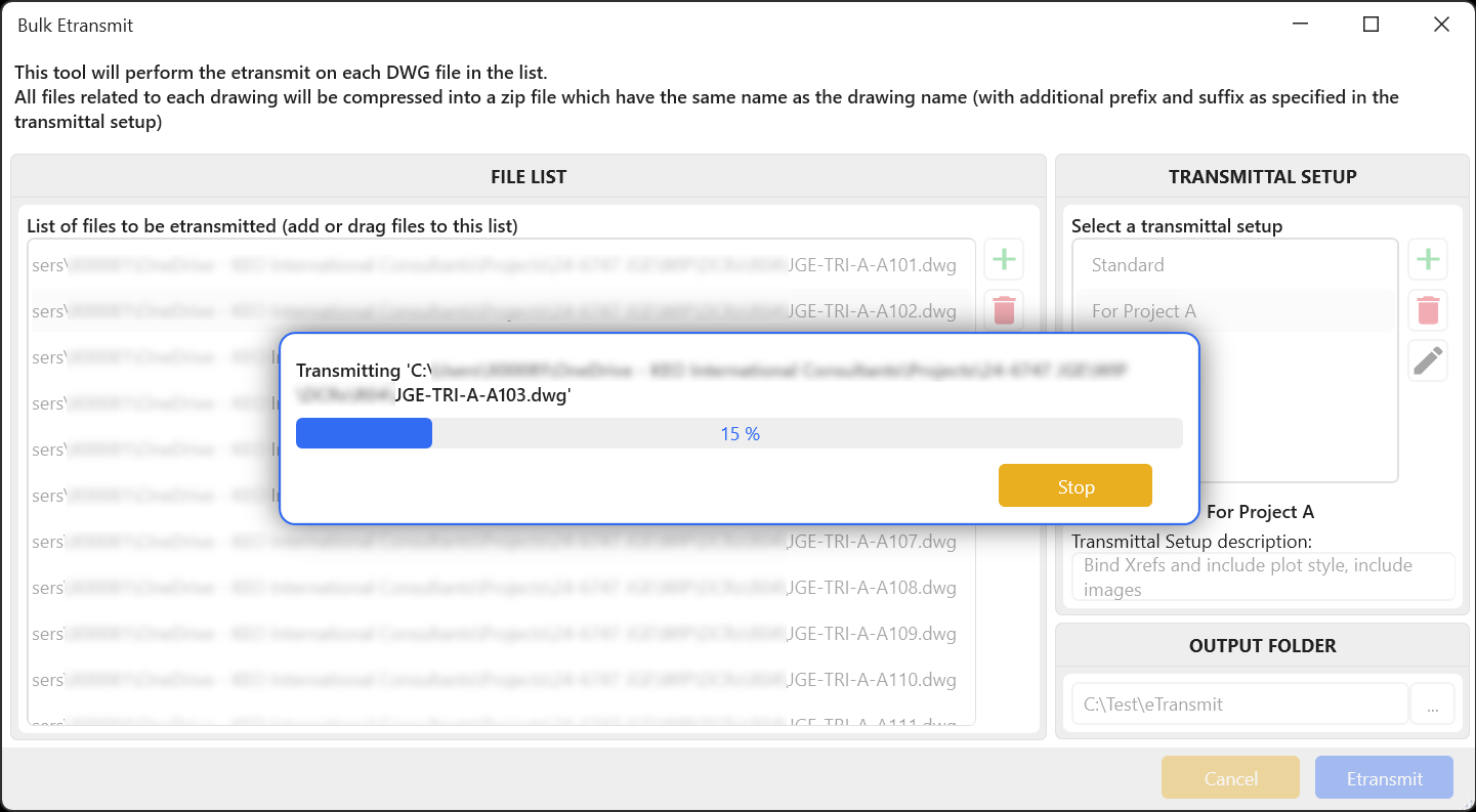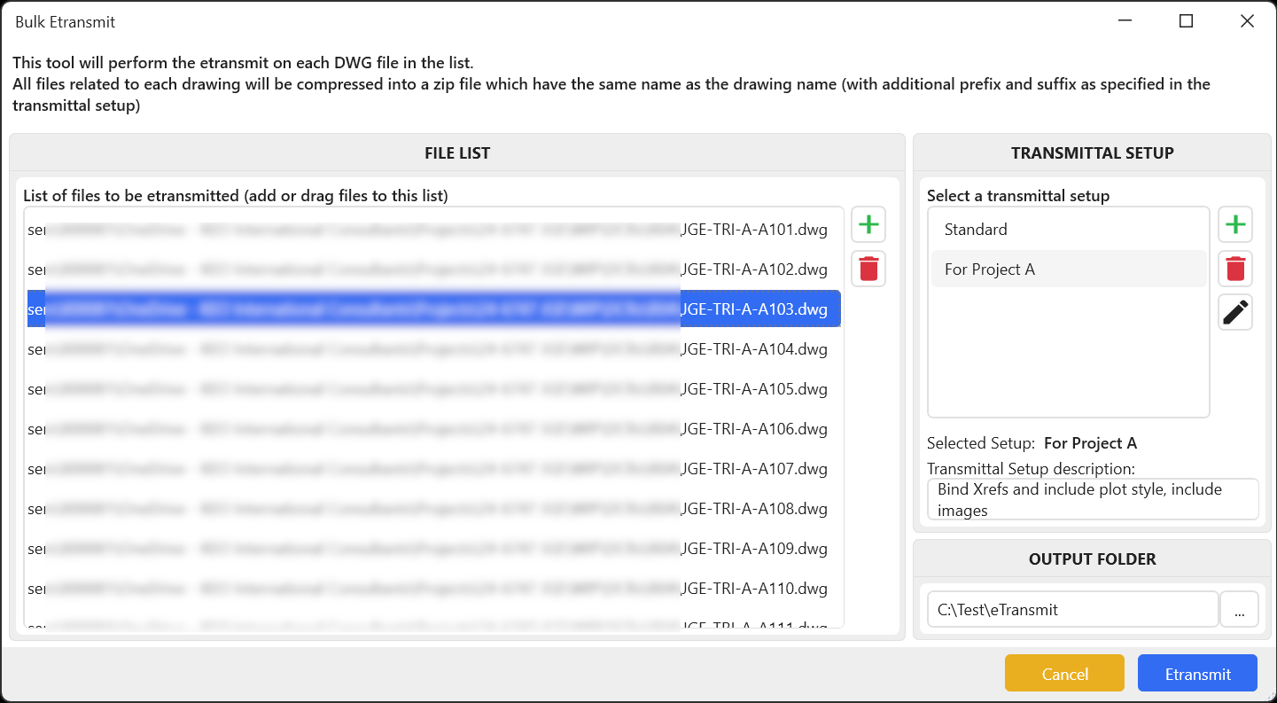 Bulk Etransmit is a specialized tool designed to automate and simplify the creation of transmittals for multiple Autodesk® AutoCAD® drawings simultaneously. With features similar to AutoCAD’s built-in transmittal options, this tool enhances efficiency by allowing users to batch-process drawings, apply custom naming conventions, and generate transmittal packages effortlessly.
