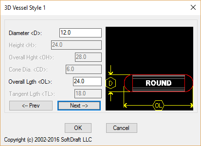 Tanks 3D provides a parametric library including five vertical tank styles and three horizontal vessel types. The program has a simple dialog box interface allowing the user to specify the dimensions before placement.