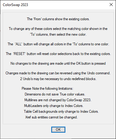 Select objects or entire drawings, and ColorSwap will scan them for colors, whether they are set bycolor, Bylayer, or nested within a Block or set by a Dimension or Table Style.