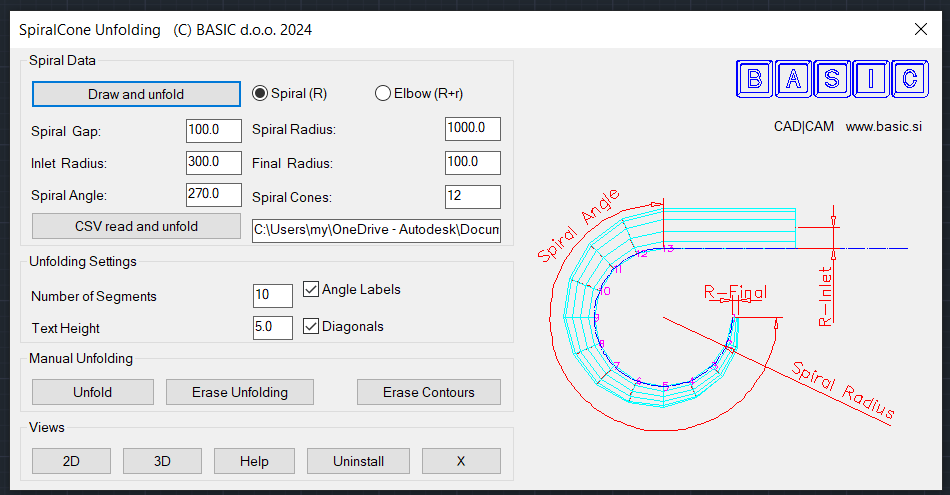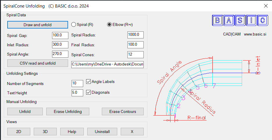 Elbow is curved pipe. Centre of pipe cross-sections (= arcs) lay on circle. It is represented by a number of cones connected at cross sections. Elbow is defined by Spiral radius, Inlet radius, Final radius, Spiral Gap (for welding), Angle and Number of cones.
