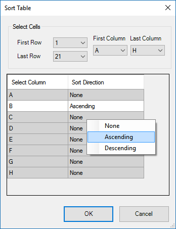 You can sort ascending or descending. Cells with blocks and merged cells also are sorted.