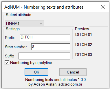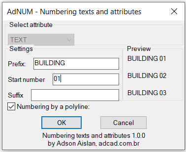 If you select a block with attributes, choose the attribute tag to number in the pop-up. If you select a text, the pop-up list will be disabled for selecting a tag. For both cases, set the prefix, suffix, and starting number (prefix and suffix are optional). You can also select the option Numbering by a polyline.