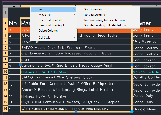 To begin a sort, select a range of cells to be sorted, either by using the table header indicator or by dragging to select a range of cells.
