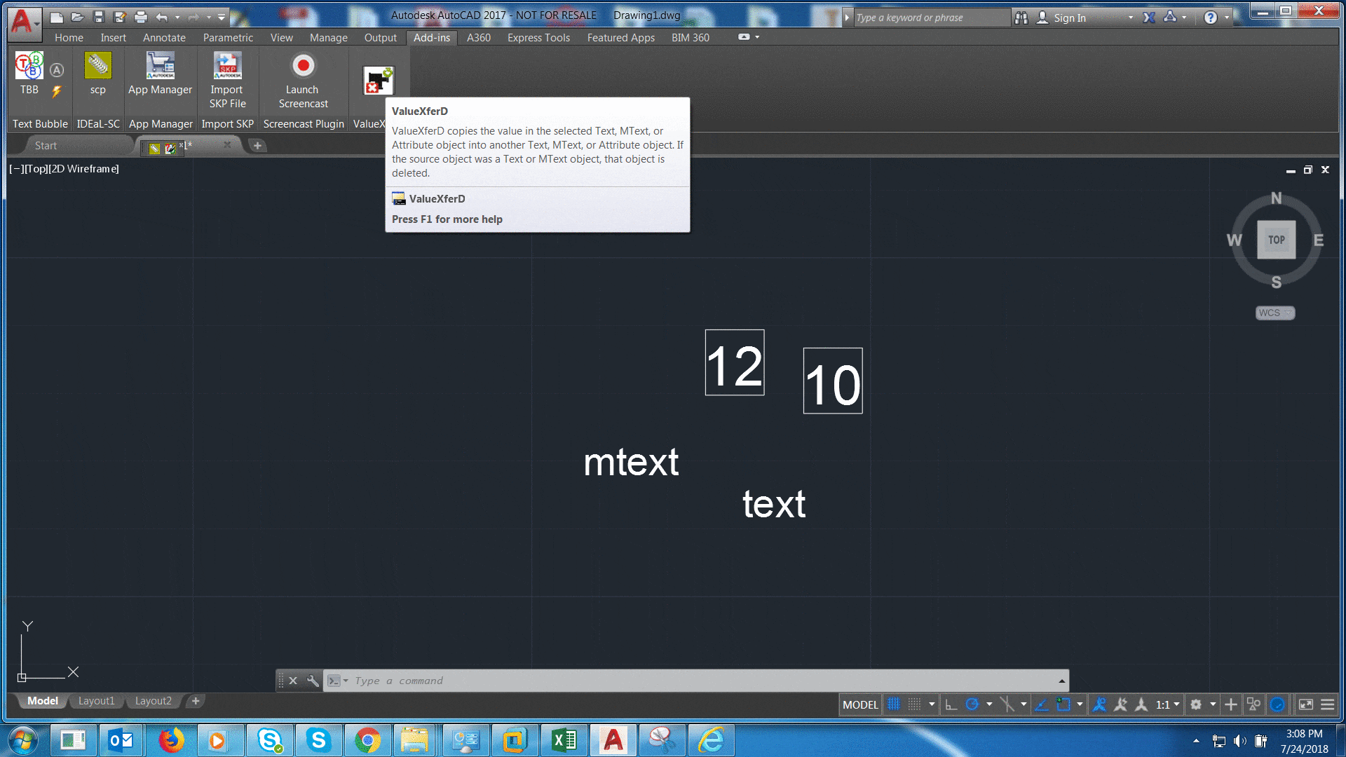 ValueXferD copies the value in the selected Text, MText or Attribute object into another Text, MText or Attribute object. If the source object was a Text or MText object, that object is deleted. Source Attribute objects will be left as is. If copying a value from an MText object into a Text or Attribute object the hidden \P characters will be removed and replaced with spaces. If copying from a multiline MText object into another MText object the hidden \P values will remain intact resulting in another multiline MText object. |