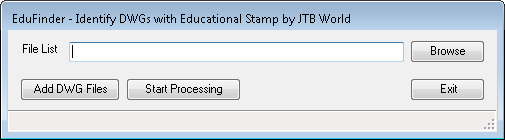 Find and identify AutoCAD drawings (DWG, DWS, DWT) that contain the educational stamp. Click on Browse and specify the location for the file list (default named DrawingsToProcess.txt). This is a text file that will be created holding the DWG files to process. Click on Add DWG Files and select a folder or drive to search. All subfolders will be searched, and if there are a lot of folders and drawings, this can take some time. Repeat for multiple folders. Click on Start Processing to begin identifying DWGs with the Educational Stamp. When ready, the file DrawingsLog.TXT will be created in the same folder as the File List. Start Excel and open DrawingsLog.TXT. If a drawing has an educational stamp, TRUE will show in the Educational Stamp column.