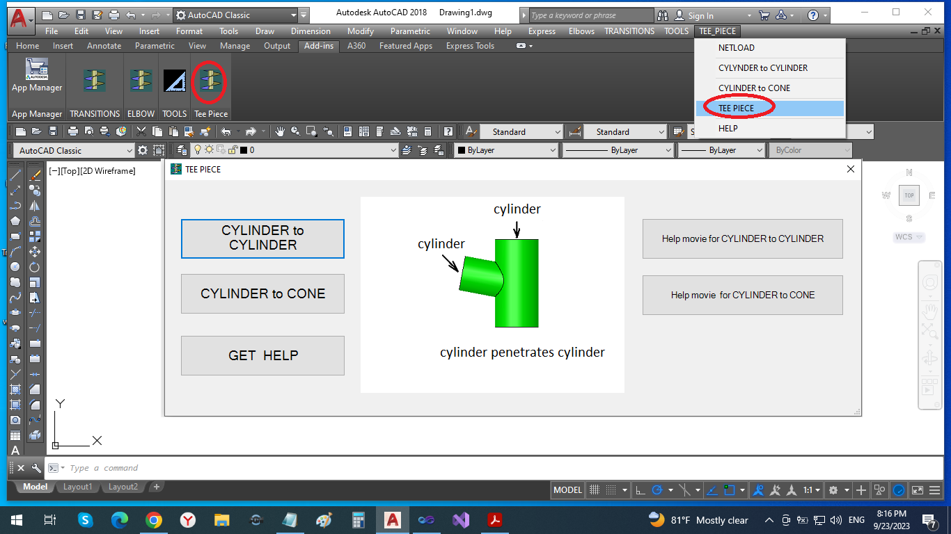 This application makes the unfolding of two types of pipe elements: A cylindrical pipe intersects into a cylindrical pipe or a cone-shaped pipe.