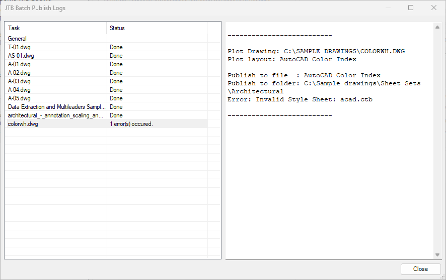 JTB Batch Publish is an app for Autodesk® AutoCAD® that publishes sheets in Sheet Sets or the Project Navigator, layouts in other drawings, folders, or drawings in DSD files to files like PDF, DWF, PNG, or JPG/JPEG. The files created are named as you want based on a naming formula that you specify. Use date fields block attributes, and/or sheet properties of your choice to build up the output filename. Publishing to printers can be done too.