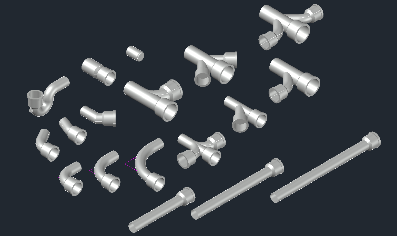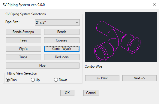 SV Hub & Spigot 3D Piping System inserts pipe and fittings in three different 3D views - Plan, Turned Up, and Turned Down.