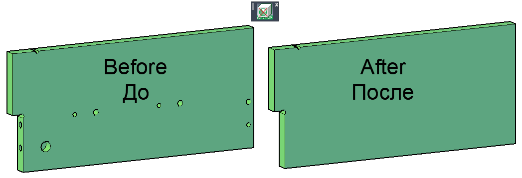 - Removal of all solid holes at once (fast), or removal of holes one by one (slow). The latter allows in many cases to save the solid from destruction due to glitches in AutoCAD.