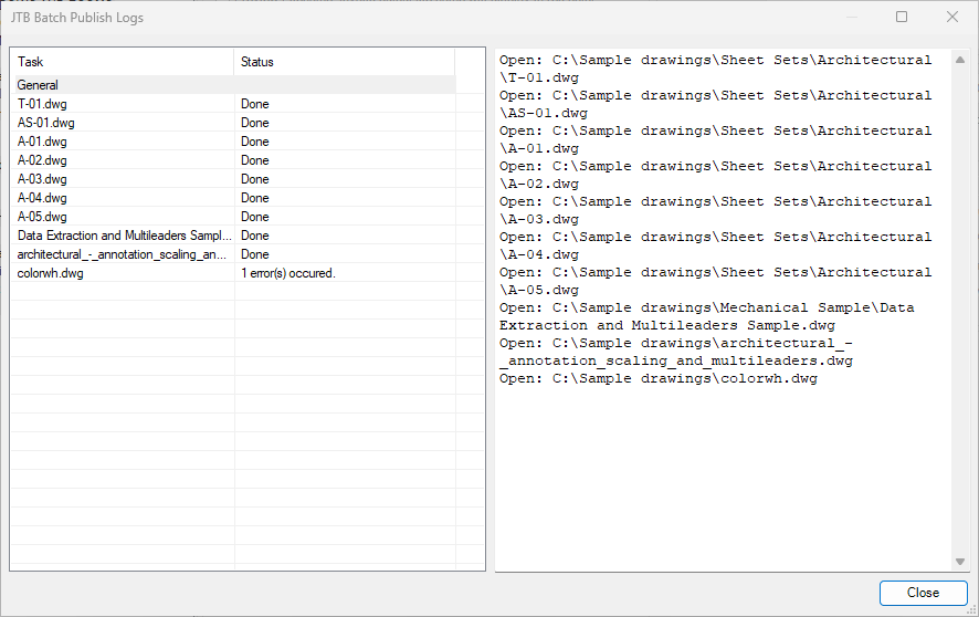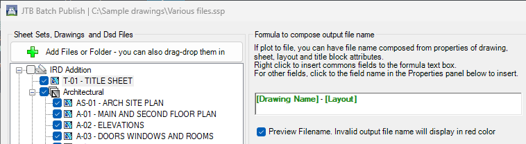 JTB Batch Publish is an app for Autodesk® AutoCAD® that publishes sheets in Sheet Sets or the Project Navigator, layouts in other drawings, folders, or drawings in DSD files to files like PDF, DWF, PNG, or JPG/JPEG. The files created are named as you want based on a naming formula that you specify. Use date fields block attributes, and/or sheet properties of your choice to build up the output filename. Publishing to printers can be done too.