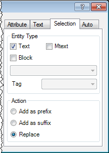 - The 'Selection' tab is used to edit existing Text, Mtext, or Attribute objects by prefixing, suffixing, or replacing them with an incremented value. The user chooses one or more entity types and selects the action to perform.