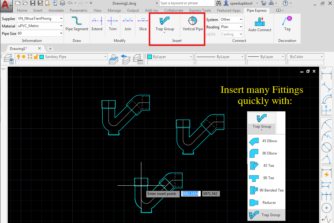 Pipe Express_Alpha is a plugin that creates professional 2D pipe drawings in Autodesk® AutoCAD® software. With the fitting library combined in this application, you can save time in finding/creating/inserting into your drawing. The simple user interface (UI) helps you get used to the operation of this application quickly.
