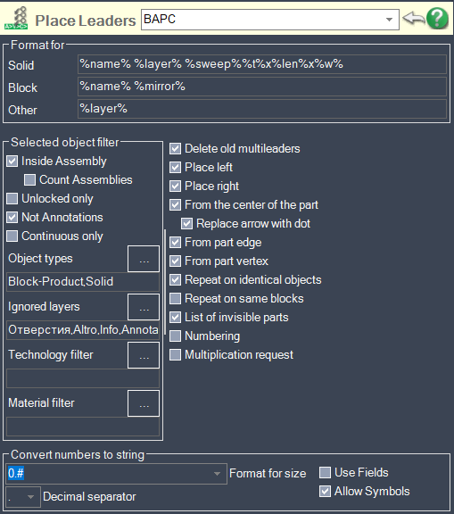 The Smart Leader program and the drawing object property substitution system are used to extract any data and fill in the multileader according to the template. For example, you can write part dimensions or materials on a multi-leader.