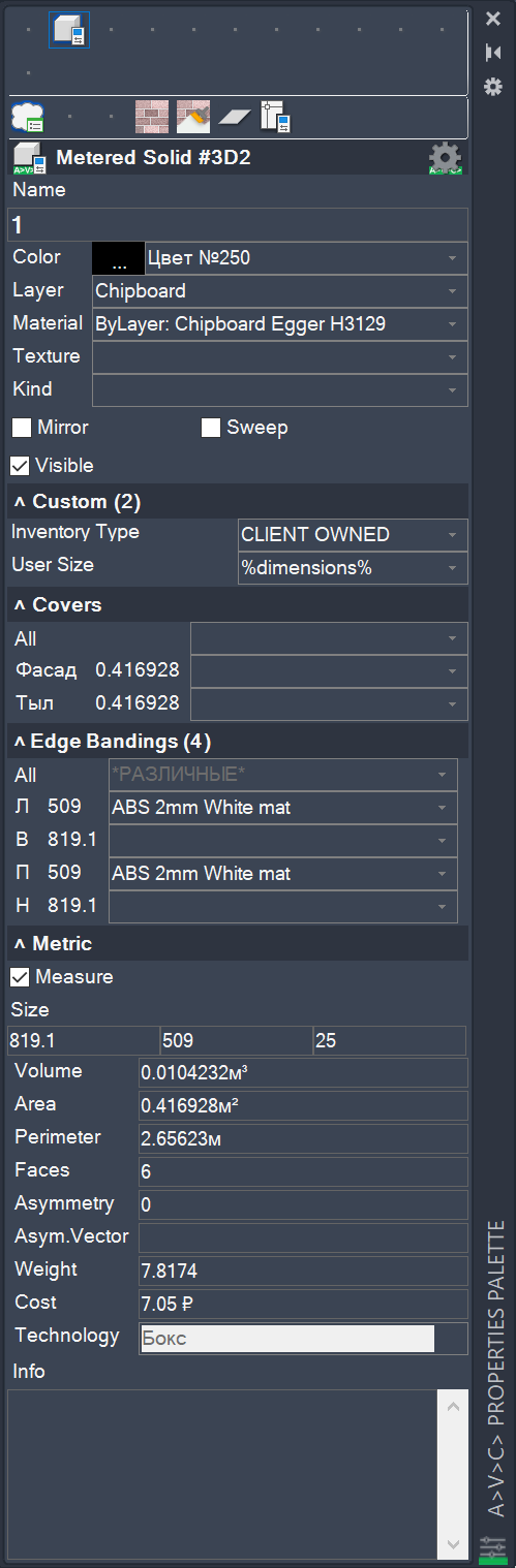 The plugin has several settings of its own, and in addition, its work is affected by the A>V>C> Common Options. If you develop your plugins or programs in LISP, then you can read all the data displayed in this palette. All this data is stored in xData ("extended data") solids and other objects. At your request, I can add any other properties to any objects in the drawing. Negotiable price.
