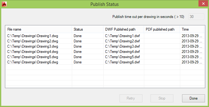 The status of the batch publishing operation is stored on disk, allowing it to pick up from where it left off and also for any failed documents to be retried without starting from scratch. A setting is available to only publish drawings that have been modified since they were last published, making it easier to publish sets of documents on a regular basis.