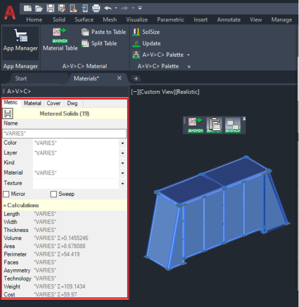 This plugin will come in handy if you want to count the number of materials for purchases or make a list of material tags with marked-on parts. First, you need to assign materials to parts (3D solids). This means the usual render material, which is in the properties of any drawing object in Autodesk® AutoCAD®. You can also assign materials to individual solid faces - these materials will be considered coatings (laminate, paint, edges). If you want to recalculate the amount of material in pieces (sheets or rods) or you need the weight of parts, and the cost of materials, then you need the program A>V>C> Properties palette. It will add sheet dimensions, density, and price to the properties of common materials. Then you can call the MatTable command, and create and save the Table of Materials.