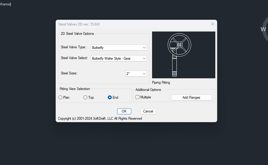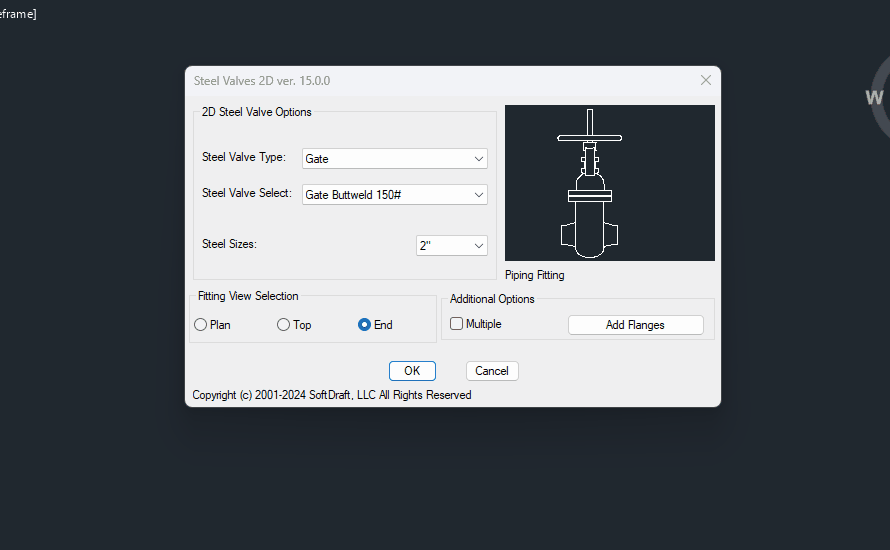 Steel Valves 2D allows the user to easily place valves in various 2D views by selecting one of the toggles on the dialog.