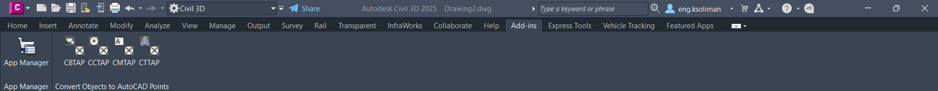 As shown in the screenshots below, after installing the add-in, a menu will appear in the Add-ins menu. It is called Convert Objects to AutoCAD Points. In each menu, there are four buttons for each object.
