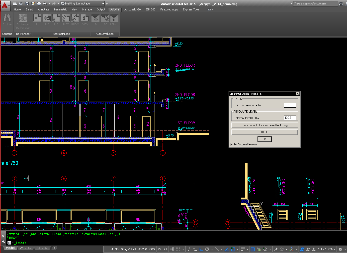 AutoLevelLabel allows one-click insertion of blocks, labeling the absolute and relative elevation of a point, and being automatically updated if moved. The first time you start an AutoLevelLabel command in a drawing, you're asked to place the 0.00 relative elevation and to specify the absolute elevation for it. A LevelBlock labeled 0.00=<your absolute elevation> is inserted. The following LevelBlocks you insert will automatically generate values for relative and absolute elevation. If you copy a LevelBlock, the values in the new instances of the block will be updated accordingly to their placement.