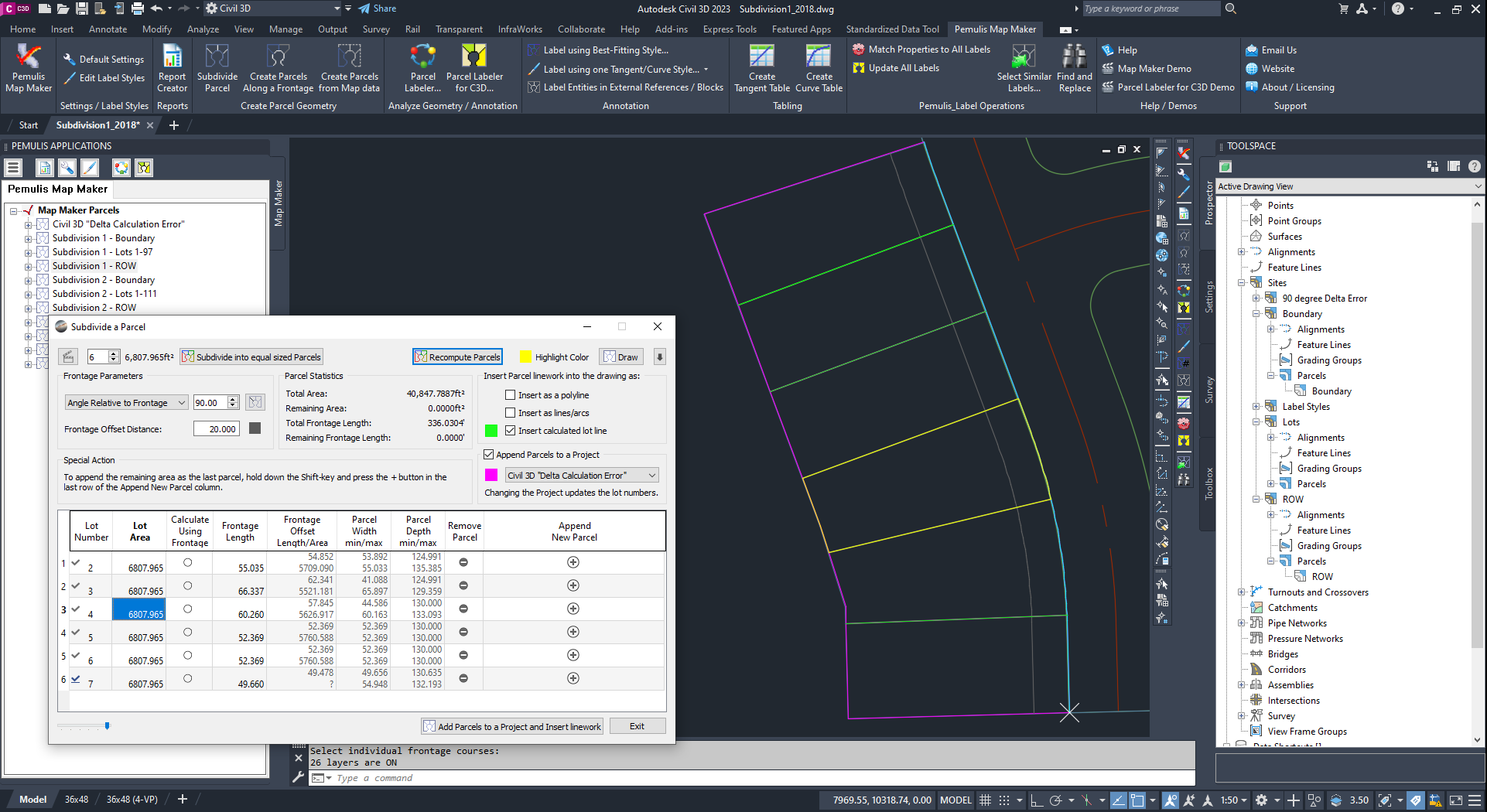 Create parcels by subdividing a closed area, by creating parcels along a frontage, and create parcels from deed data.