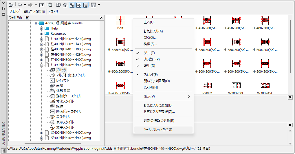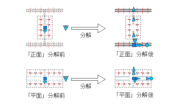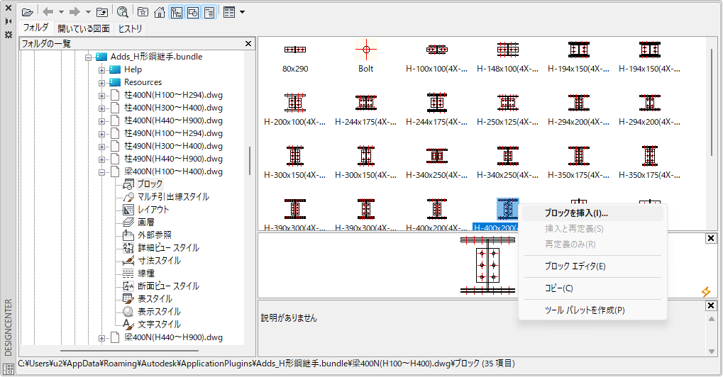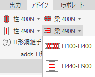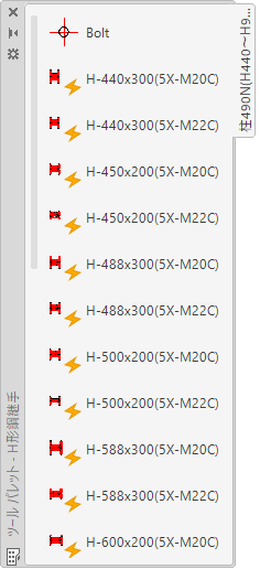 標準H形鋼継手(柱・梁用)ダイナミックブロック192個が用意されています。ひとつのブロックで平面・正面・断面・文字(部材)の切り替えができ、さらに平面・正面ではプレートの大きさや角度、ボルト本数の変更も可能です。