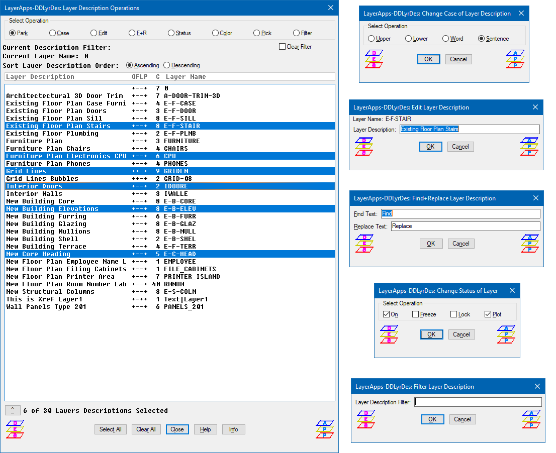 (7) DDLyrDes - Places in a list box Layer Names sorted by their Description to perform the following operations: Case/Edit/F+R/Status/Color/Pick/Filter.