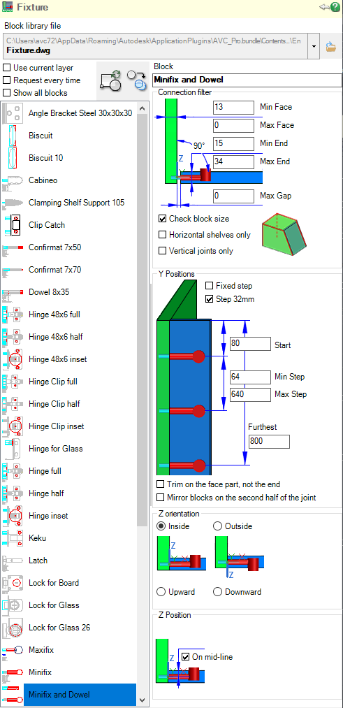 With the program comes a small library of popular fixtures: RTA fittings, Fasteners, Furniture hinges, Shelf holders, Hardware, Confirmat, Minifix, Häfele Rafix, Angle Bracket, Catches, Wood Dowel and Biscuits, Door Locks and Latch, Intersection Sleeve and Tapping screw... These elements - blocks containing solids, it is convenient to use for further subtraction of fixing holes using the command Drill.