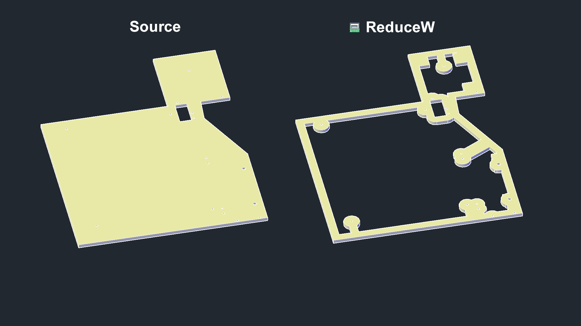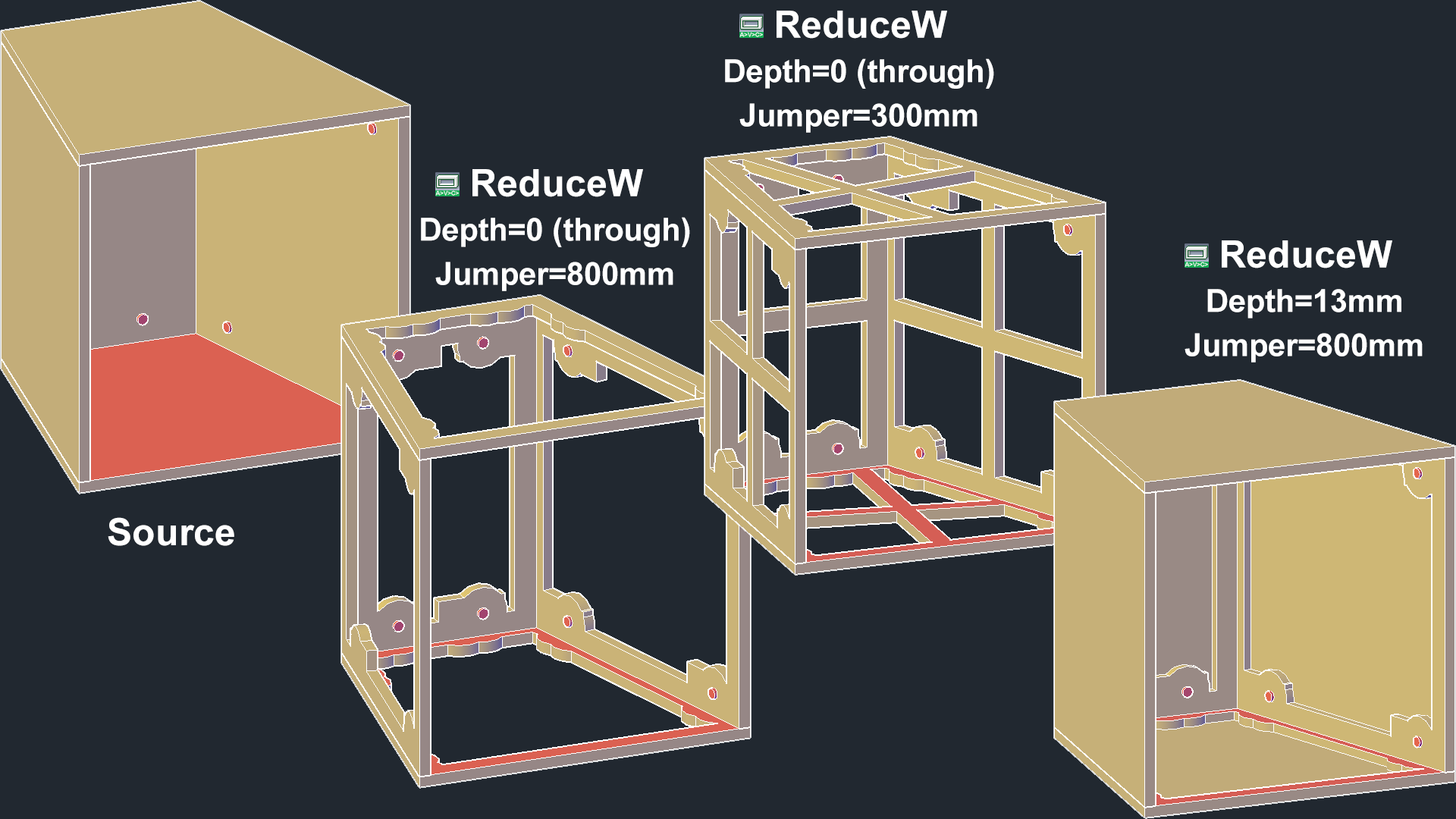 This program can be useful when you design plywood or MDF products for exhibition stands, interior design, offices, and shops. Often there is a need to reduce the weight of structures. To do this, you can cut out the extra parts of the supporting invisible structures, that is, make windows in the middle of the parts, or make pockets on the inner invisible sides of the parts. Usually, the process of designing such windows is long and inconvenient. You must get the outer contour of the part, offset the contour inside the part, extrude the 3D solid, and subtract it from the part. The matter can be complicated due to the need to keep the dadoes and holes in the attachment points with other parts. It is also necessary to leave jumpers so that the windows do not turn out to be too long, and the entire assembly retains its rigidity. But all these problems can be solved in 1 click. You only need to call the Reduce Weight command (ReduceW) and it will do all this work with all the selected parts.